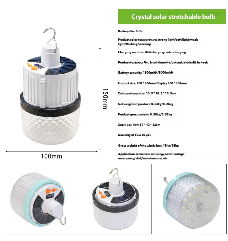 Specifications: 100W Solar Crystal Rechargeable Light (Single Battery)